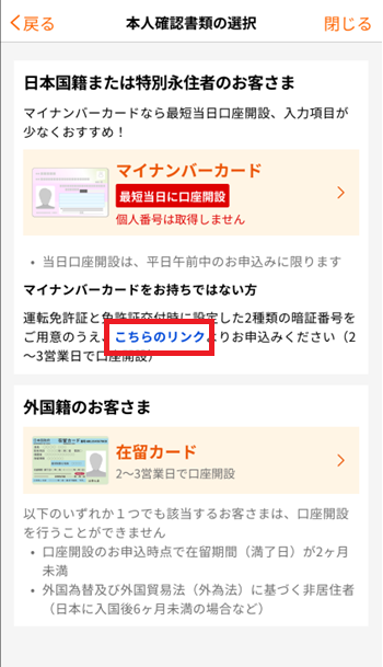 本人確認書類の選択画面内の「マイナンバーカードをお持ちではない方」と記載されている箇所にある「こちらのリンク」をタップし、運転免許証の読取画面に進んでください。
