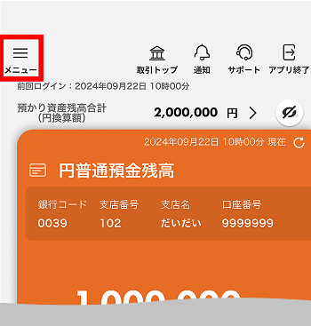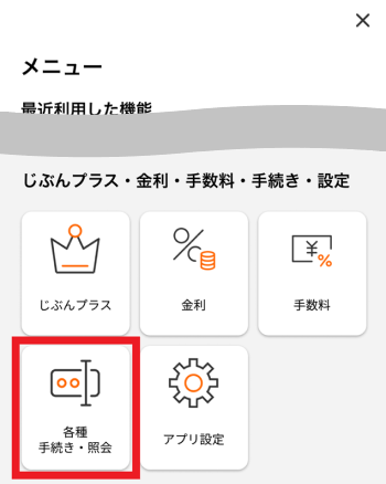 1. じぶん銀行アプリにログイン後、左上[メニュー]→[各種手続き・照会]を選択
