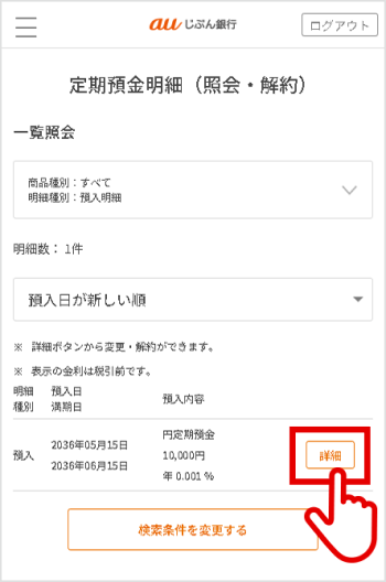 作成した定期預金の設定状況は、インターネットバンキングの[円定期預金]メニュー内、[明細一覧]の[詳細]にてご確認いただけます。