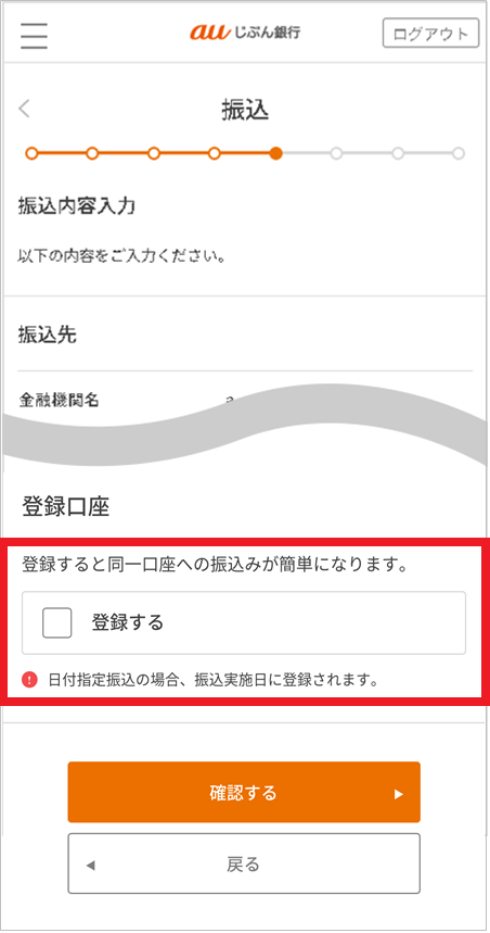 振込内容の入力画面下部にて、「登録する」にチェックを入れて振込手続きを完了させてください。